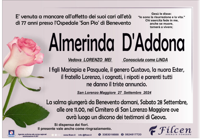 E’ venuta a mancare all’affetto dei suoi cari all’età di 77 anni presso l’Ospedale ‘San Pio’ di Benevento