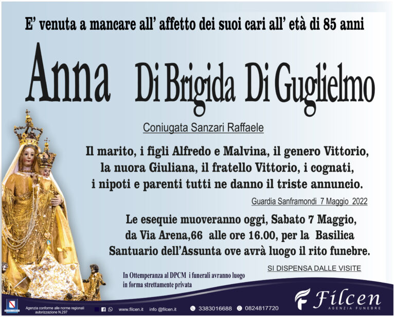 E’ venuta a mancare all’ affetto dei suoi cari all’ età di 85 anni
