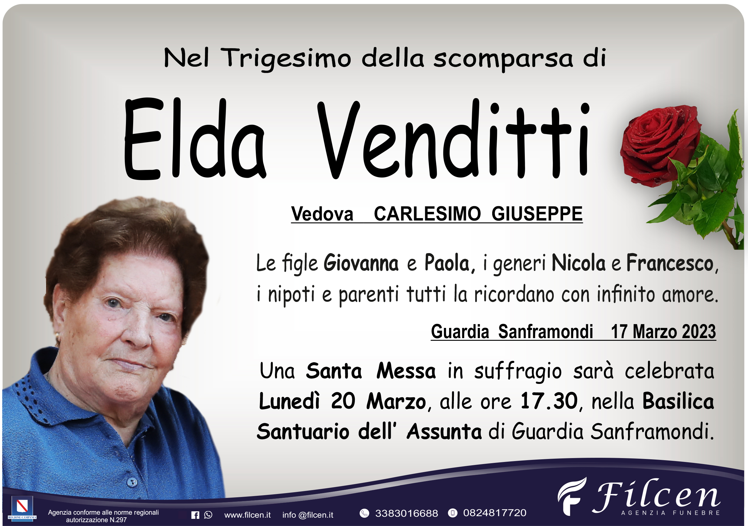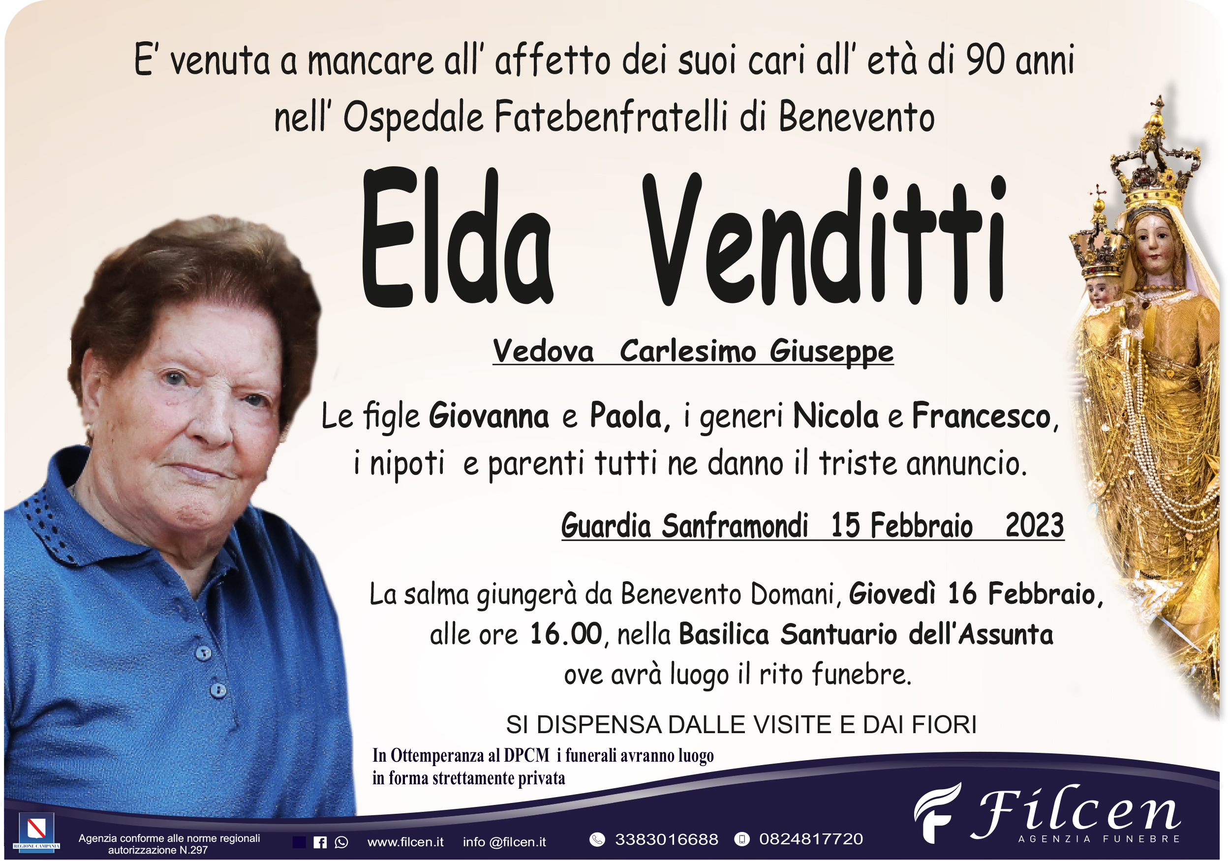 E’ venuta a mancare all’ affetto dei suoi cari all’ età di 90 anni nell’ Ospedale Fatebenefratelli di Benevento