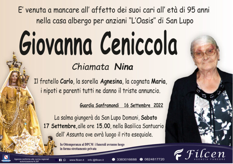 E’ venuta a mancare all’ affetto dei suoi cari all’ età di 95 anni nella casa albergo per anziani ‘‘L’Oasis’’ di San Lupo