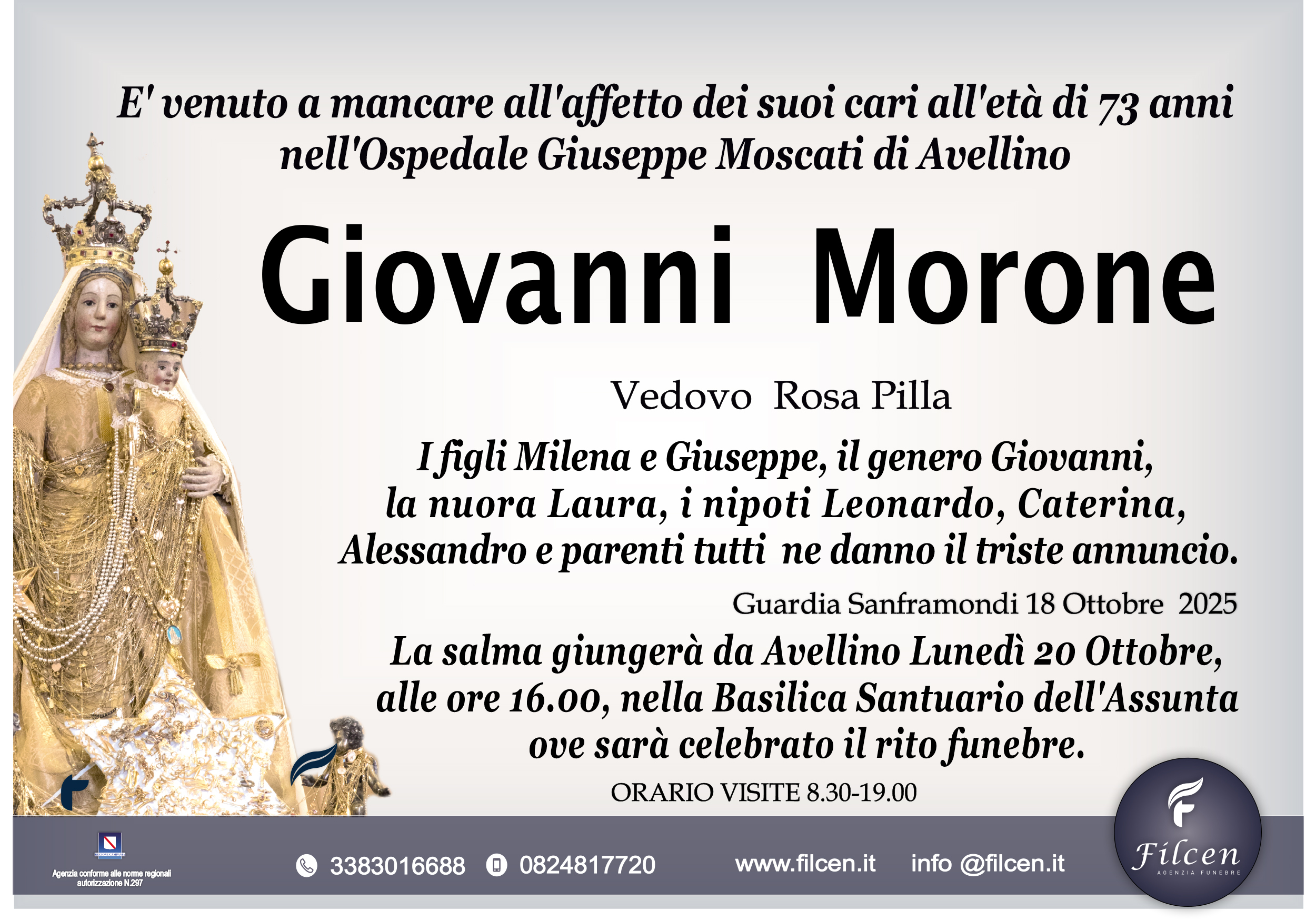 E’ venuto a mancare all’affetto dei suoi cari all’età di 73 anni nell’Ospedale Giuseppe Moscati di Avellino
