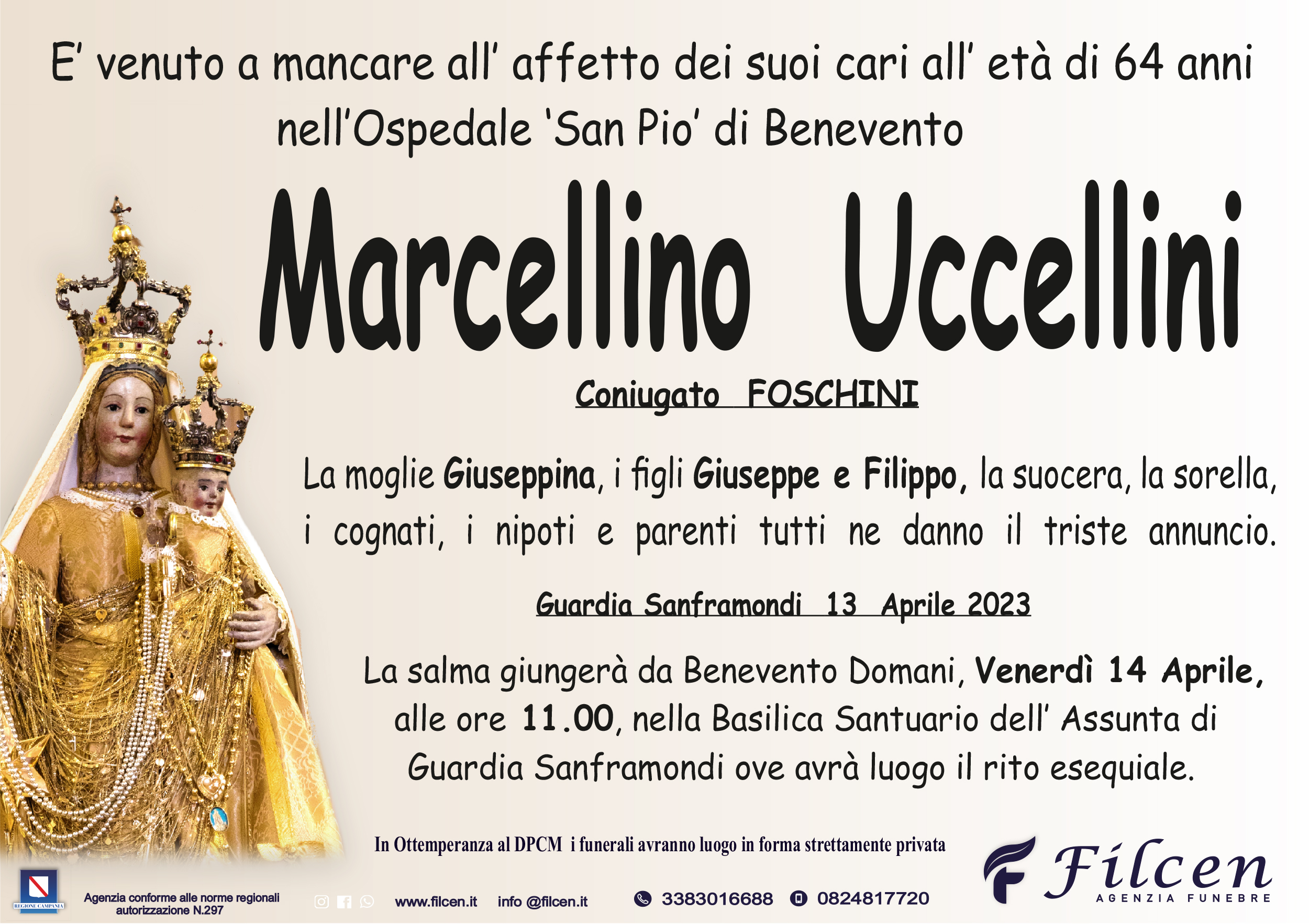E’ venuto a mancare all’ affetto dei suoi cari all’ età di 64 anni nell’Ospedale ‘San Pio’ di Benevento