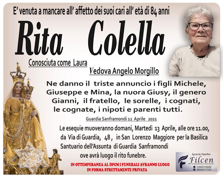 Le esequie muoveranno domani, Martedì 13 Aprile alle ore 11:00 da Via Guardia, 48, in San Lorenzo Maggiore per la Basilica Santuario dell’Assunta ove avrà luogo il rito funebre