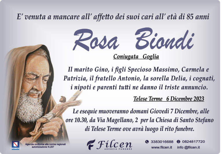 E’ venuta a mancare all’affetto dei suoi cari all’età di 85 anni